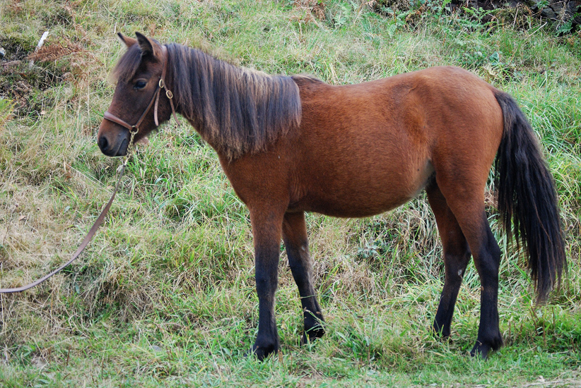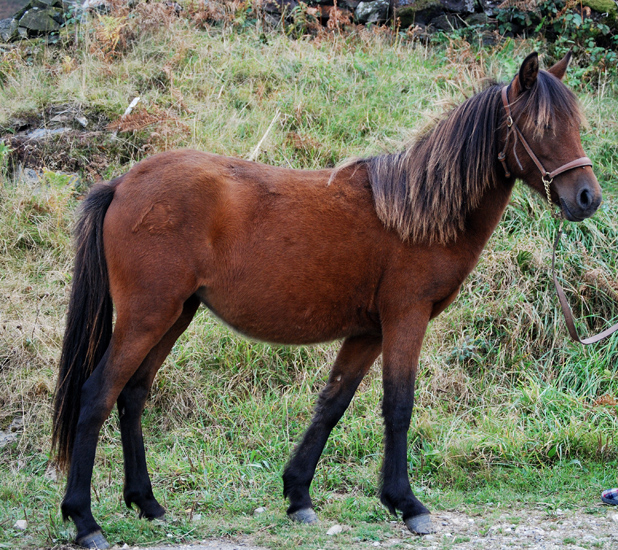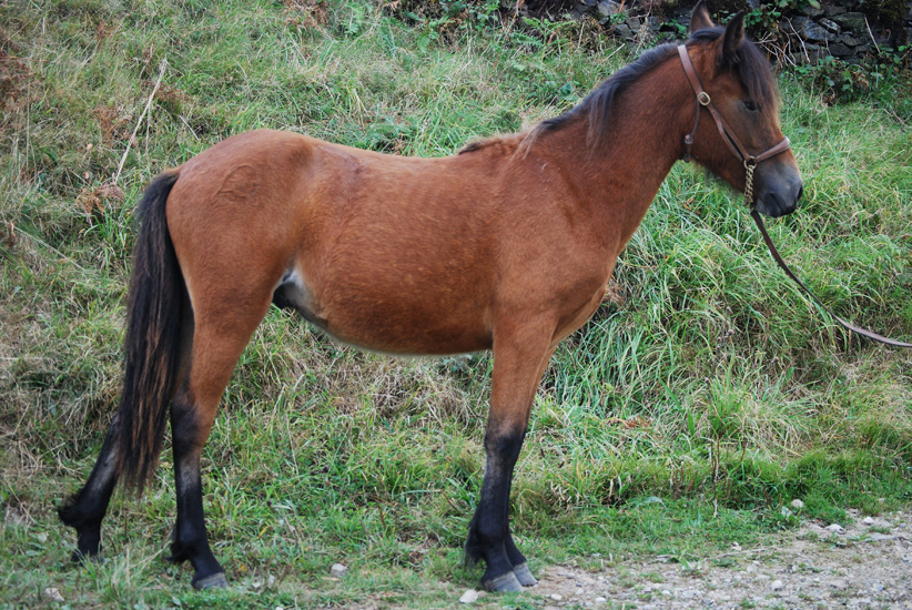 Capa castaña oscura, con raya de mulo simple y cruzada y cebraduras en antebrazos y extremidades posteriores.